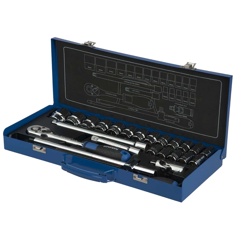 مجموعهی فوق یکی از محصولات تولیدی شرکت «هیوندای» (Hyundai) است. این محصول شامل آچار بکس و سریهای متصلشونده به آن میشود. شرکت هیوندای این مجموعه را بهشکل 24 عددی تولید میکند تا کاربر بتواند با آزادی عمل بیشتری انواع پیچ و مهرههای مختلف را باز کند. در این مجموعه 18 سری بکس 2/1 اینچی در سایزهای 10 و 11 و 12 و 13 و 14 و 15 و 16 و 17 و 18 و 19 و 20 و 21 و 22 و 23 و 24 و 27 و 30 و 32 میلیمتری وجود دارد. از دیگر متعلقات این محصول میتوان به یک اضافهشوندهی طول 25 سانتیمتری، یک اضافهشوندهی طول 12.5 سانتیمتری، یک دستهی T شکل با قابلیت تغییر طول بازو بهطول 30 سانتیمتر و یک لقلقهی 8 سانتیمتری با مفصلی متحرک اشاره کرد. کار با این سریها از طریق دو دستهی 26 و 40.5 سانتیمتری مقدور میشود. دستهی 26 سانتیمتری این مجموعه ازنوع جغجغهای بوده و دستهی دیگر از یک طراحی ساده برخوردار است. شرکت هیوندای این مجموعه را از آلیاژ کروم وانادیم تولید کرده است.